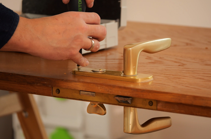 Efter tørring sættes beslagene fast på døren igen. Skraldesættet kan bruges igen til dette. Så er døren færdig, og du kan gå videre til næste projekt.