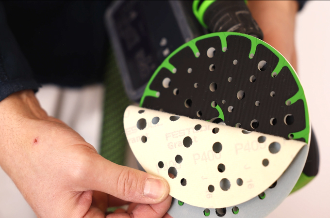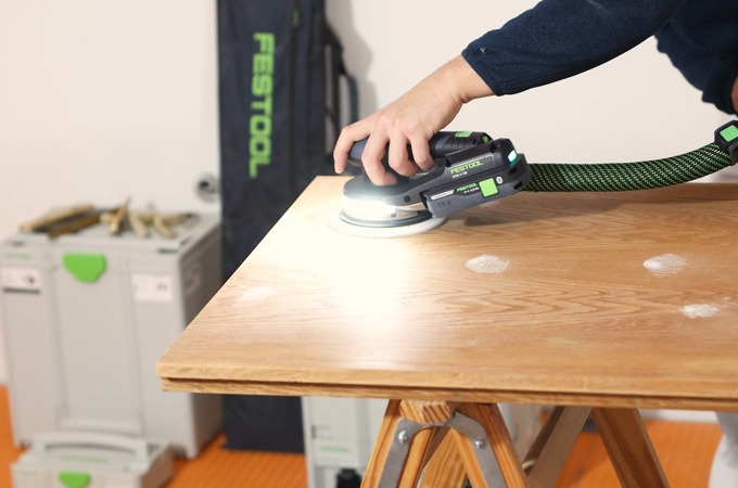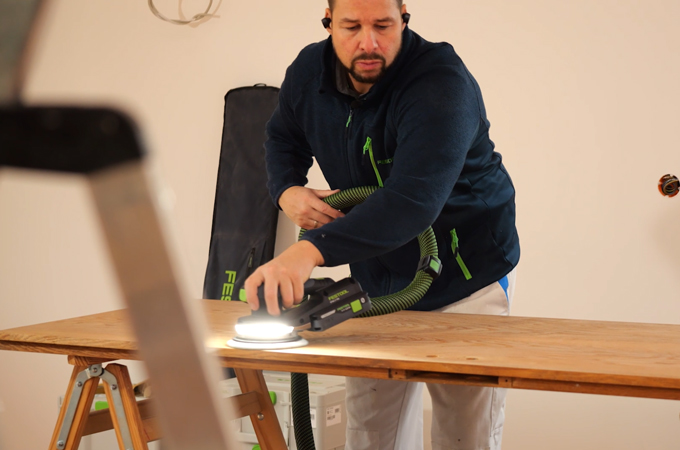 Nu sliber vi døren. Vi bruger en excentersliber - helst ETSC 2 150 - for at opnå en jævn overflade af høj kvalitet. Vi anbefaler at bruge P180 korn Granat universal sandpapir som slibepapir. Det sikrer, at begge sider af dørbladet slibes jævnt. Takket være det integrerede lys kan eventuelle ujævnheder eller skader på dørens overflade ses direkte og markeres med en stift, hvis det er nødvendigt.