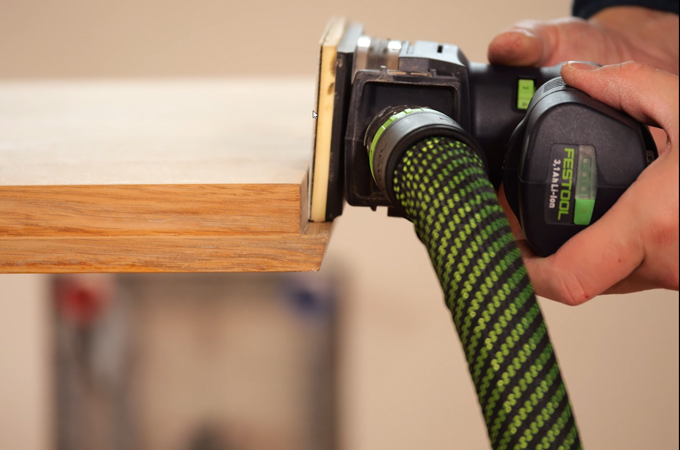 Det anbefales at bruge en excentersliber til at slibe falsene på dørbladet. En RTSC 400 kan f.eks. også bruges her med en kornstørrelse på P180. Falsene kan slibes lettere takket være den perfekte pasform. Svært tilgængelige områder kan bearbejdes med et håndslibeklods. Efter slibning skal støvet fjernes fra døren. En passende støvsuger med et pensel-mundstykke er velegnet til dette.