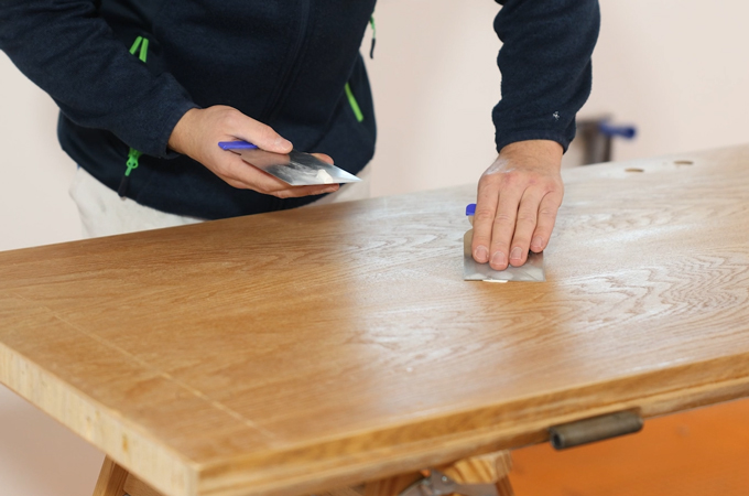 Når man sliber døren med ETSC 2 og dens integrerede lys, bliver ujævnheder og ridser tydelige. Den lille KALC Arbejdslampe bruges til at kontrollere overfladen igen i detaljer, og beskadigede områder markeres med en blyant. Skaden udjævnes derefter med en japansk spatel og syntetisk harpiks eller fin filler for at opnå den glatest mulige overflade. Tip: Når du påfører filler, skal du sørge for, at den fjernes rent for at opnå et jævnt resultat.