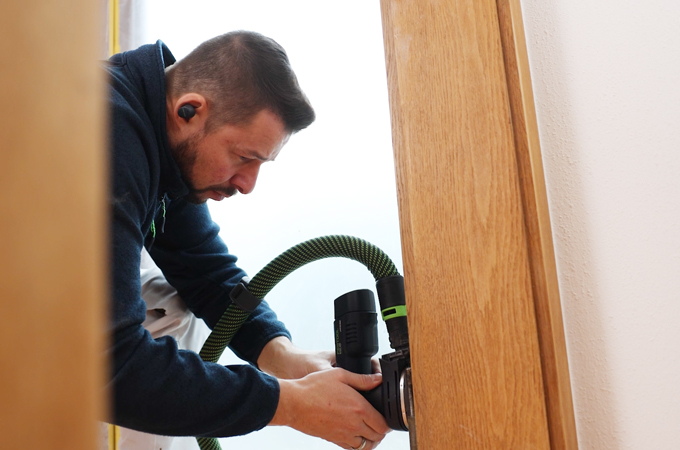 Mens spartelmassen tørrer på dørbladet, forberedes dørkarmen også. Fremgangsmåden er stort set den samme som for dørbladet. En excentersliber som RTSC 400 anbefales til rammen, da den har mange kanter og falsninger. Også her bruger vi korn P180 Granat-slibepapir. Finish og detaljer kan derefter bearbejdes med granathåndsliberen. Det resterende støv fjernes med pensel-mundstykket og CTMC Midi. Beskadigede områder skal også repareres med filler og japansk filler.