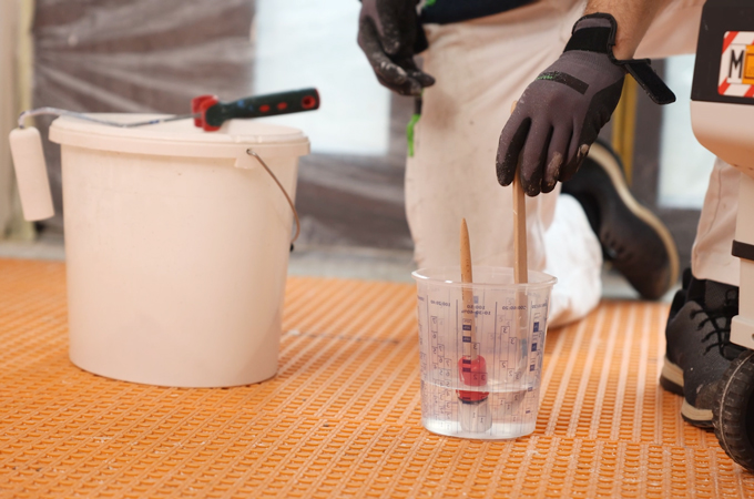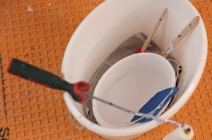 Før maling rengøres overfladerne igen med en støvbindende klud. På svært tilgængelige steder kan man afskærme med guldtape for at beskytte f.eks. væggen. Malerværktøjet og den grundmaling, der skal bruges, er klargjort og kan placeres på Festool-støvsugeren i en behagelig arbejdshøjde. For at beskytte dem anbefaler vi, at du afskærmer støvsugeren med en avis eller lign. og opbevarer værktøj og maling i en spand for at undgå unødig tilsmudsning.