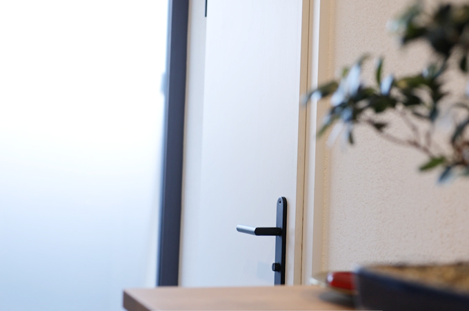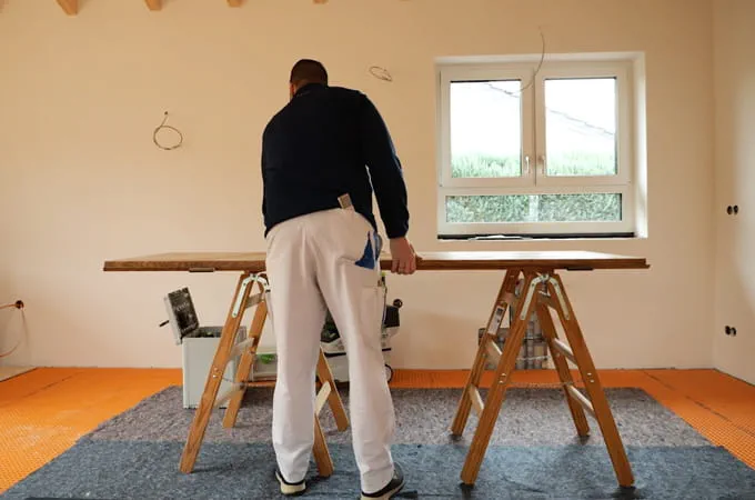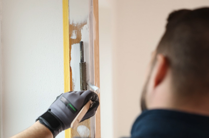 Det første skridt er at tjekke døren. Er der synlige skader, eller skraber døren mod gulvet? Hvis der er problemer, anbefaler vi at justere døren til gulvhøjden. Gulvhøjden ændrer sig ofte under renoveringer - enten på grund af gulvvarme eller en ny gulvbelægning. Vi måler derfor den nye højde ved dørhængslerne og afkorter dørbladet til den rigtige højde ved hjælp af en dyksav og føringsskinne.