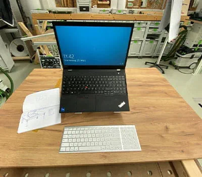 I dette anvendelseseksempel fremstiller vi sammen en lem i en fineret bordplade, så du kan opbevare computeren i bordet efter arbejdet og bruge bordet til andre formål. Rummet kan også bruges til andre ting. Da den udskårne lem skal monteres igen, og vi ikke vil ændre på fiberforløbet, skal snittet til højre og venstre for savklingen være absolut flossefrit. Dyksaven med forridser kommer os her til hjælp.