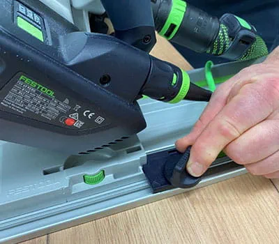 For at kunne dykke sikkert og præcist ned i starten af snittet uden at skære over markeringen kan man placere stopbeslaget sådan på skinnen, at savklingen skærer perfekt på markeringen.