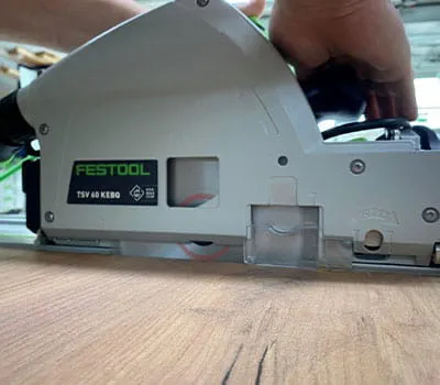 Vi kører nu langs markeringen med saven. Skueglasset giver et perfekt udsyn til savklingen, så man tydeligt kan se slutningen på markeringen.