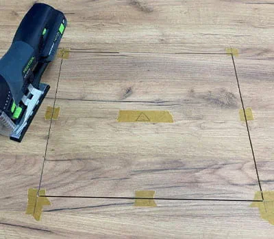 Forridseren har ligesom hovedsavklingen markeringer på savens hus, så man kan se starten og slutningen af savklingen. Anbring saven sådan, at markeringen ligger ind mod markeringen på bordet (se billedet). Forrids nu den første af fire markeringer med saven. Rids ved hjælp af skueglasset, og brug igen markeringen på huset som hjælp. Herefter skæres der med hovedsavklingen. Til det formål deaktiveres forridseren, hvorved hovedsavklingens blokering ophæves.