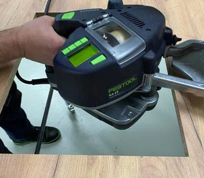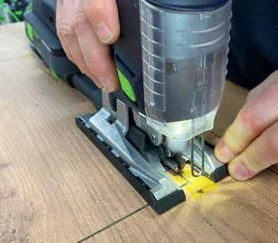 Vi stikker stiksavklingen forsigtigt i og saver alle hjørner til. Herefter forberedes kanterne og kantlimeren. Følg også her brugsanvisningen. Dette er dog kun nødvendigt, hvis der anvendes spånplade e.l. som materiale. Arbejdes der med multiplexplader, kan de næste trin springes over (fortsæt med trin 15).