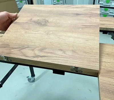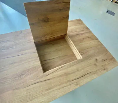 Det kan være en god ide at montere et skjult opbevaringsrum i/under et bord eller bag en væg/i en vægniche, hvis man mangler plads, eller også fordi det ser pænt ud. I vores tilfælde er det en bordplade af fineret spånplade. Det er vigtigt, at pladestykket tilskæres flossefrit på begge sider, da det vil blive sat ind samme sted igen i form af en lem. På den måde får man et pænt resultat, og lemmen kan næsten ikke ses.