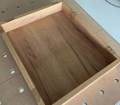 Vend bordpladen om (undersiden opad), og læg kassen på åbningen. Lim nu delene sammen, eller saml dem med dyvler, og opspænd delene, indtil limen er tørret.