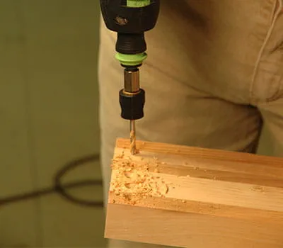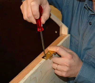 Når nu taget er lagt på og rettet til, skal hængslernes position tegnes på. Markér væggens yderside på hængslernes underkant med et spidsbor. Tag taget af igen, og skru hængslerne fast. Nu kan det komplette hus monteres og alle kanter og hjørner efterslibes. Adskil huset igen, og slib alle udvendige flader med en excentersliber.
