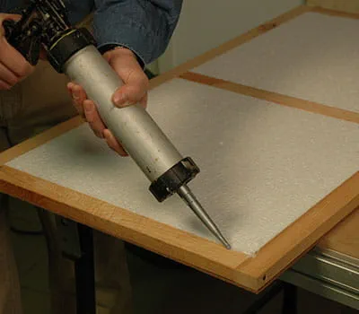Når alle indvendige plader og bundpladen (pos. 1) er skruet fast, skærer du styroporisoleringen til og lægger pladerne ind i felterne. Tegn positionerne på underkonstruktionen op på de udvendige beklædninger (pos. 6, 12). Disse limes sammen med resten af væggen (PU‑lim). Nu spændes væggens enkeltdele sammen med tvinger.