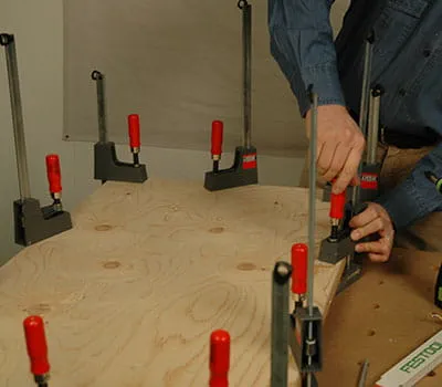 For at gøre den senere positionering lettere er det vigtigt, at du tegner tagudhænget op. Vi bruger igen PU‑lim til limningen. I dette arbejdstrin skal to personer arbejde sammen. Det tilrådes også først at indøve det hele "tørt" (uden lim). Smør lim på spærene, og fiksér beklædningen ved den ene yderkant.