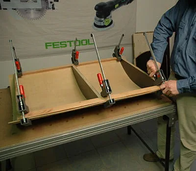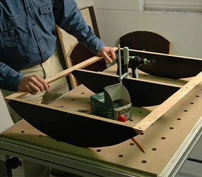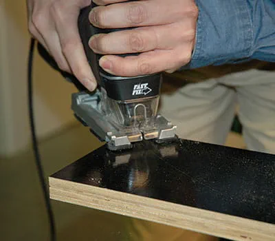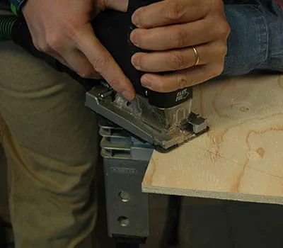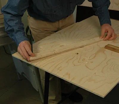 Få skåret krydsfinerpladerne til efter angivelserne i materialelisten. Hvis du selv vil tilskære enkeltpladerne, er det lettest at lægge lægter som underlag på gulvet og så skære pladerne til med en dyksav og en føringsskinne. Det har vist sig, at det er hensigtsmæssigt at begynde med at fremstille de to sidevægge