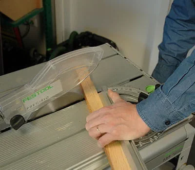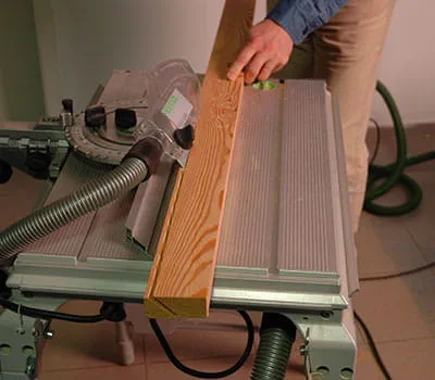 For at opnå en nøjagtig snitkant skal stiksavens pendulslag indstilles på stilling 1. Skær tagafslutningslisterne skråt til i længden med bordrundsaven. Ved snit på langs i massivt træ er det absolut påkrævet at bruge en grov savklinge. Skær listerne af i længden med bordrundsaven.