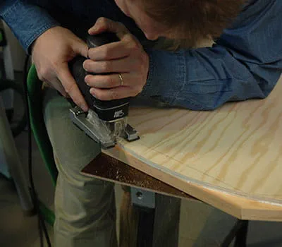Spænd de to gavle sammen, og slib den øverste bue med groft slibepapir. Hvis du har en overfræser med kopiring, kan du også fræse gavlvæggens rundinger. Tegn positionerne på underkonstruktionen (pos. 10, 11) op på gavlsiderne.
